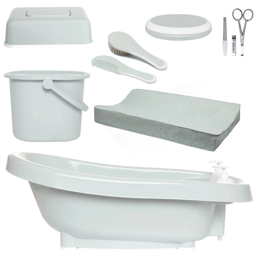 Deze set bevat een luieremmer, aankleedkussen, easy wipe box, manicureset, kapset en een thermobad met het handige click-systeem. Tevens heeft het badje een ingebouwde thermometer en twee zeepdispensers, dit maakt de set echt compleet! Al deze producten zijn erg veilig voor baby’s en maken de verzorging gemakkelijker.