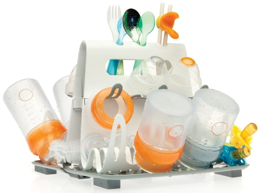Dankzij de 8 grote haken kun je alle flesjes in alle vormen en maten laten drogen aan het rekje. De 10 kleinere haken zijn ideaal voor de kleinere accessoires. Bovenin het rekje vind je 3 openingen voor bijvoorbeeld bestek, rietjes en andere kleine keukenaccessoires. Het water wordt opgevangen in de bodemlaag van het rekje.